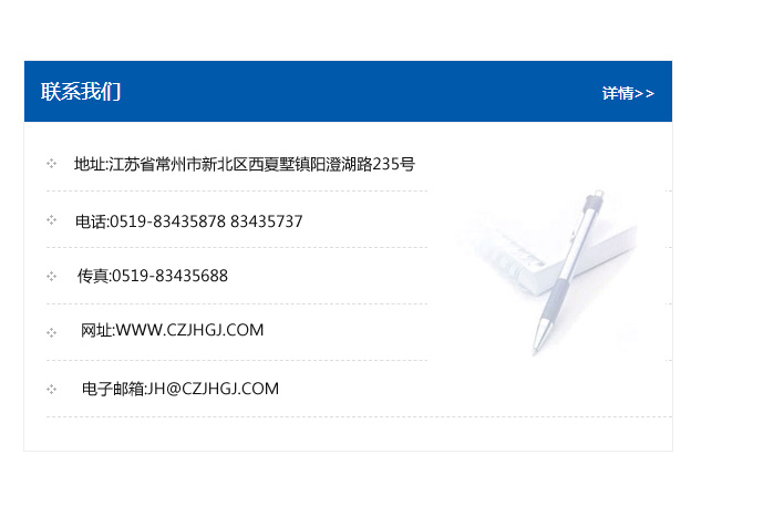 地址:常州市新北區友邦商務大廈1幢16、17層  電話:0519-85101652  傳真:0519-85112595  郵編:213022  網址:www.cz-jiayue_cn.cnsztj.com  郵箱:xiajifengaa@163.com
